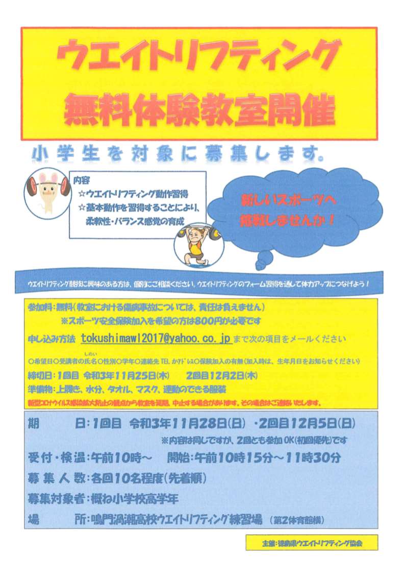 ウエイトリフティング無料体験教室を開催します(徳島県ウエイトリフティング協会)