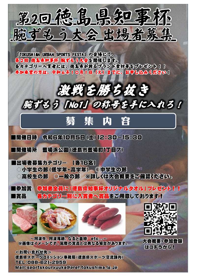 徳島県スポーツコミッション(会長:徳島県知事)では、10月5日(土)開催の、街中で楽しくクールに体を動かせるスポーツイベント「TOKUSHIMA URBAN SPORTS FESTA」に合わせて、次の日時・場所において、「第2回徳島県知事杯 腕ずもう大会」を開催します!奮ってご参加ください。