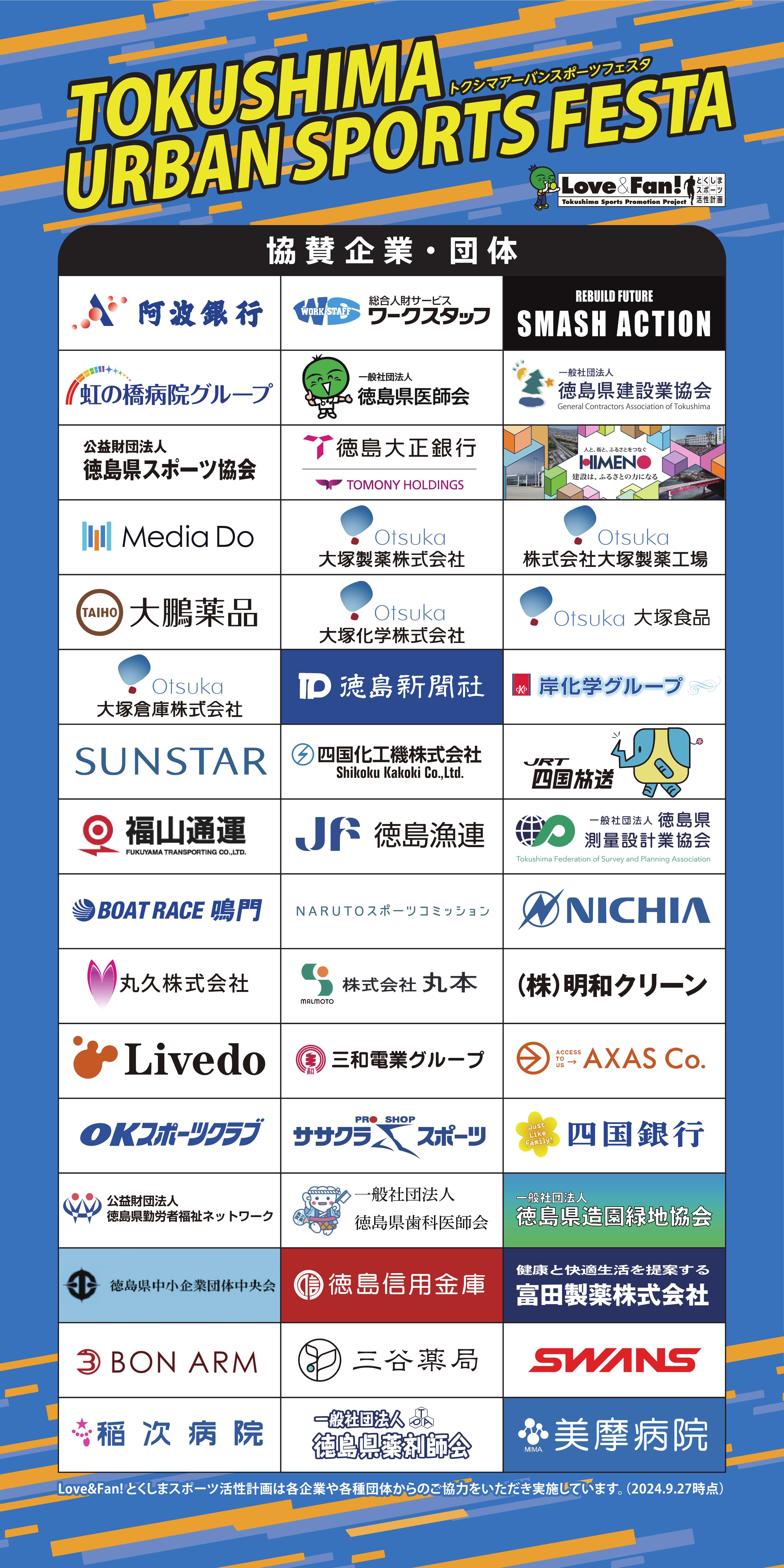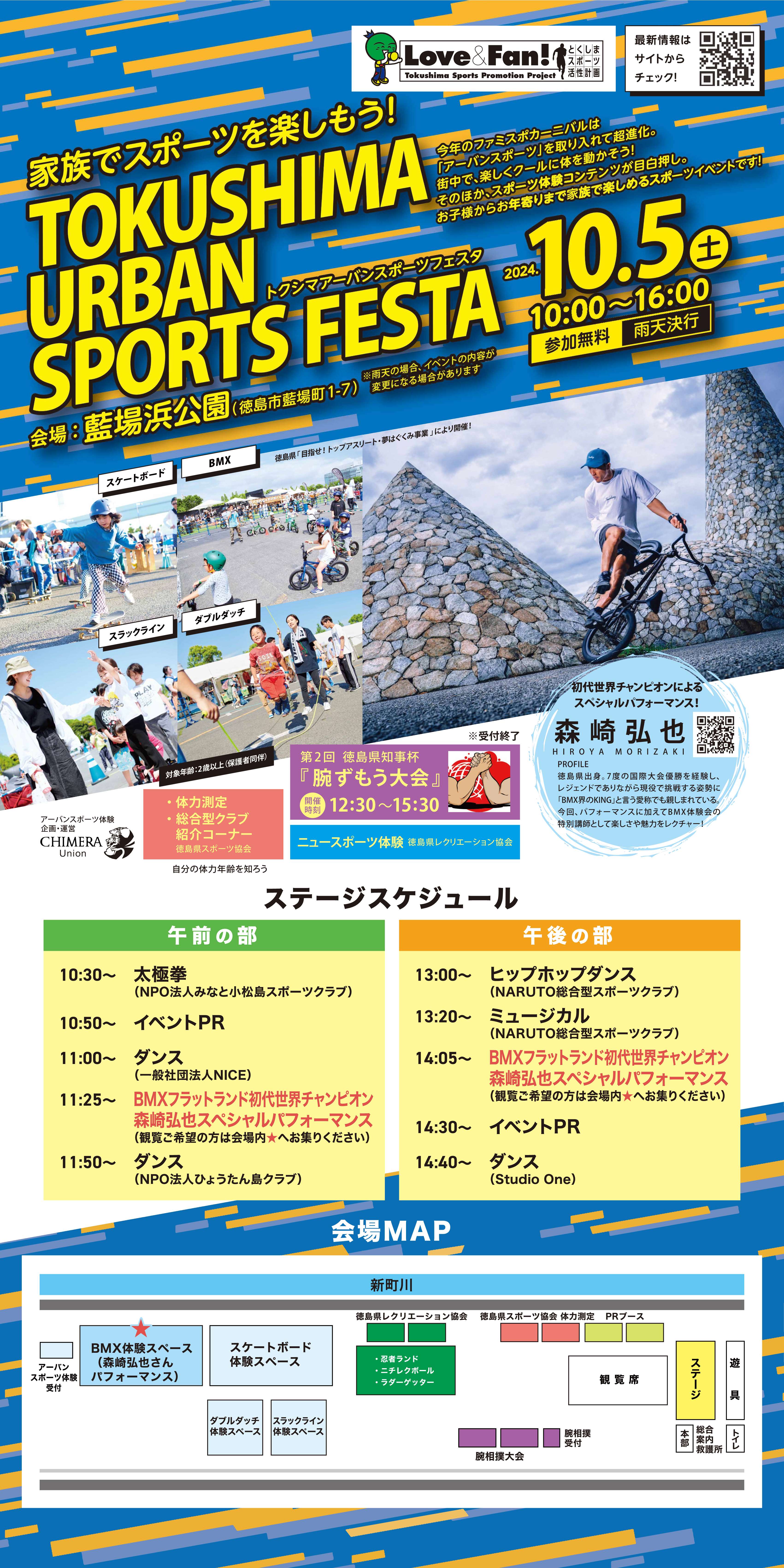 誰もが参加しやすいスポーツの体験機会を提供することにより、体を動かす楽しさやスポーツの魅力を伝え、生涯にわたるスポーツライフのきっかけづくりを目的に開催する「TOKUSHIMA URBAN SPORTS FESTA」について、次のとおりステージイベントの内容・スケジュールが決まりました!